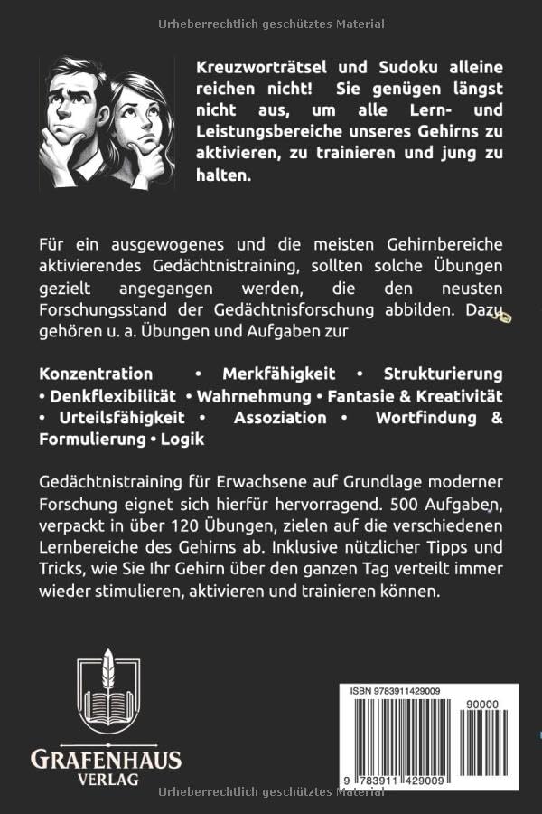 Nur durch eine Vielzahl unterschiedlicher Übungen können die verschiedenen Gehirnareale angesprochen und aus dem sog. Standby-Modus geholt werden. Jeder sollte regelmäßig kognitive Leistungen abrufen und trainieren. Also: Weiterdenken! Gedächtnistraining für Erwachsene auf Grundlage moderner Forschung eignet sich hierfür hervorragend. 500 Aufgaben, verpackt in über 120 Übungen, zielen auf die verschiedenen Lernbereiche des Gehirns ab.