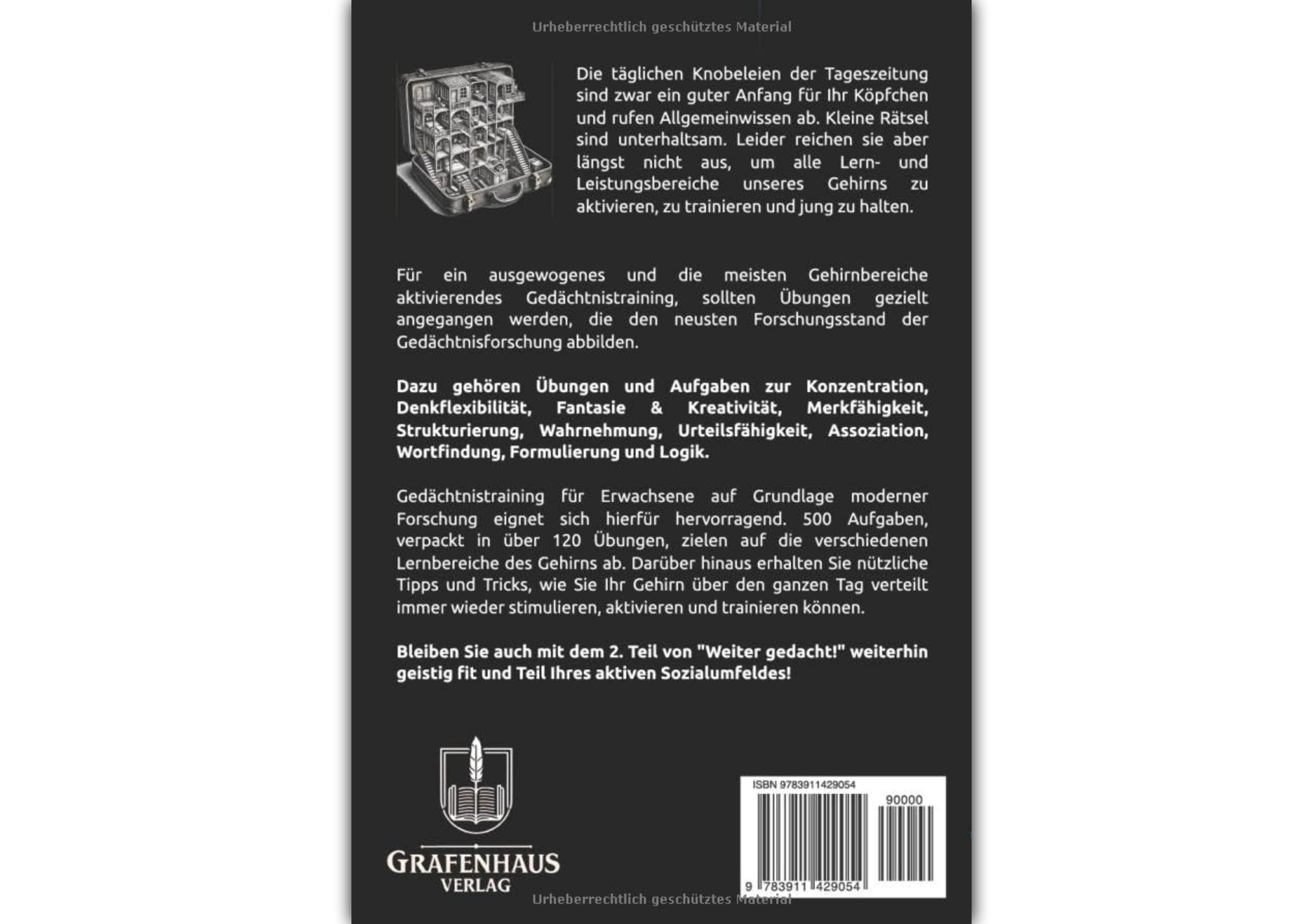 Nur durch eine Vielzahl unterschiedlicher Übungen können die verschiedenen Gehirnareale angesprochen und aus dem sog. Standby-Modus geholt werden. Jeder sollte regelmäßig kognitive Leistungen abrufen und trainieren. Also: Weiterdenken! Gedächtnistraining für Erwachsene auf Grundlage moderner Forschung eignet sich hierfür hervorragend. 500 Aufgaben, verpackt in über 120 Übungen, zielen auf die verschiedenen Lernbereiche des Gehirns ab. Darüber hinaus erhalten Sie nützliche Tipps und Tricks, wie Sie Ihr Gehirn über den ganzen Tag verteilt immer wieder stimulieren, aktivieren und trainieren können.