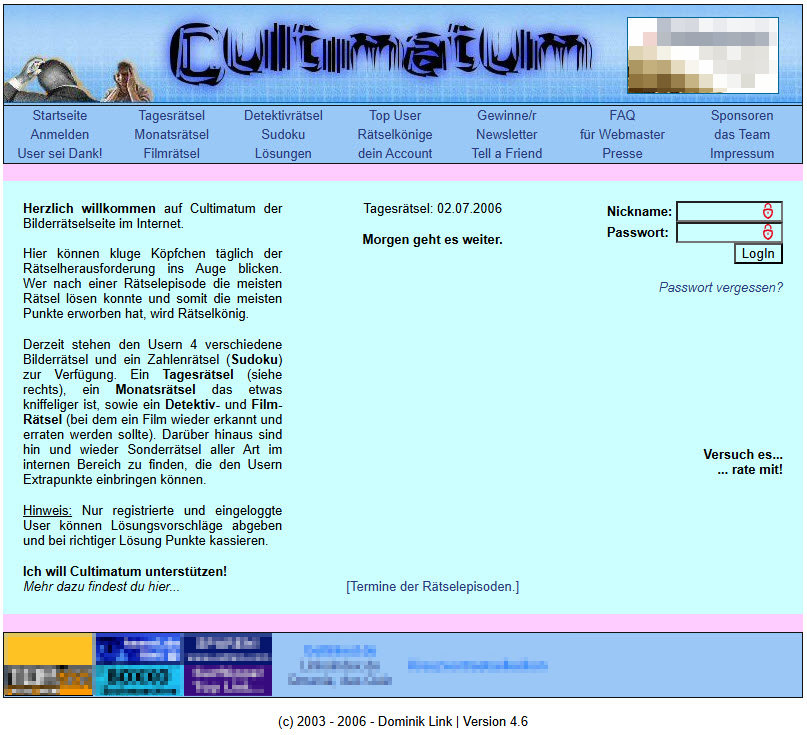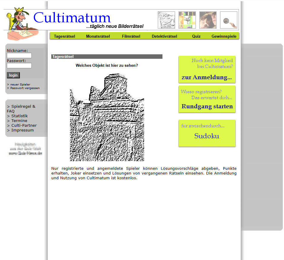 Cultimatum – das Bilderrätselportal – ging im Jahr 2003 online. Die Idee war ebenso einfach wie faszinierend: grafisch verfremdete Bilder sollten erkannt und erraten werden. Was als kleine Spielerei begann, fand schnell Anklang bei einer kleinen, aber begeisterten Gruppe knobelfreudiger Nutzer. Bald wurde daraus ein Projekt, das aus dem Alltag vieler nicht mehr wegzudenken war.